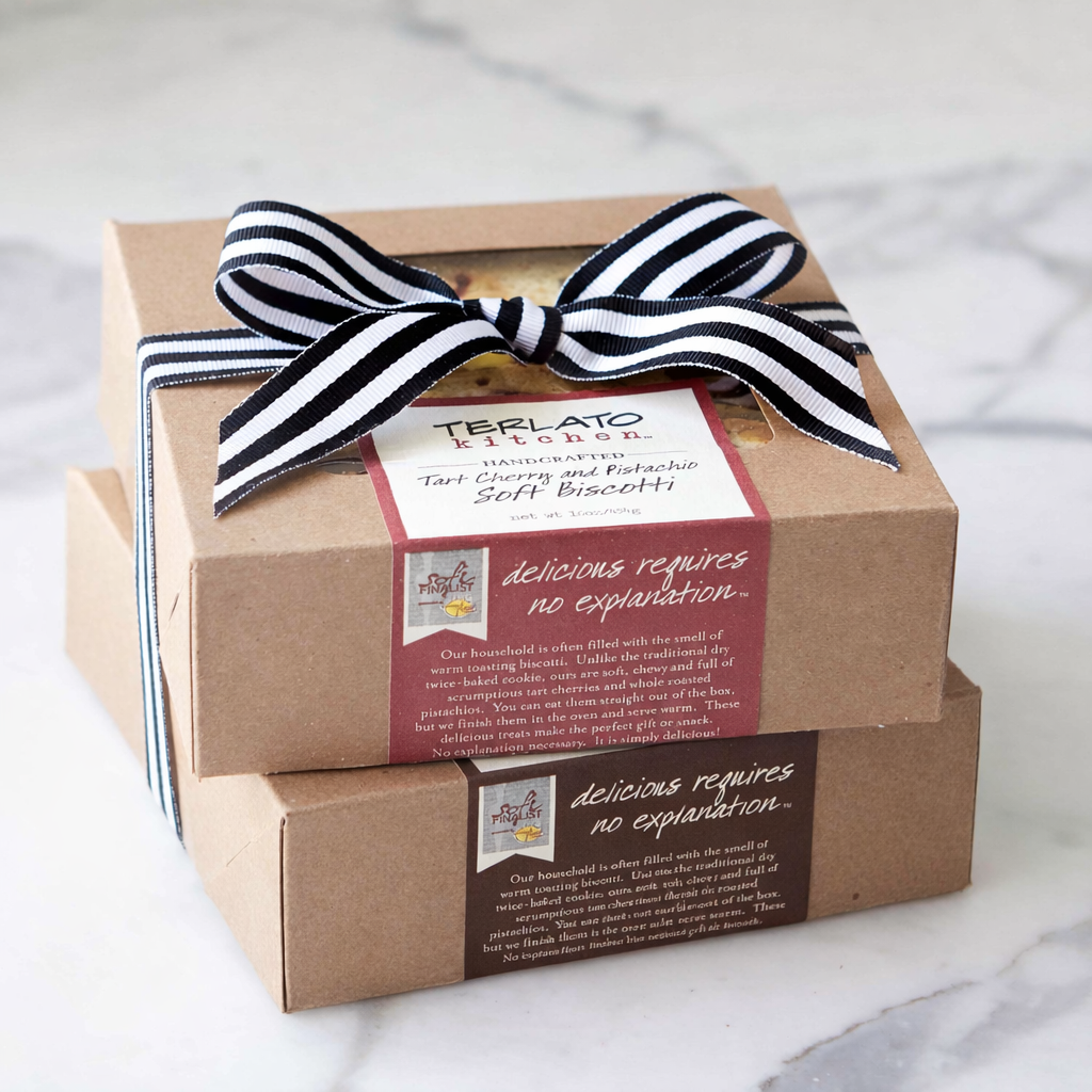 Tart Cherry and Chocolate, yum! This bowed set includes one box of our Tart Cherry Pistachio soft biscotti and one box of our Chocolate Almond soft biscotti - the perfect balance of sweet, tart, and nutty crunch. A delightful treat for gifting, sharing, or savoring with your morning coffee.